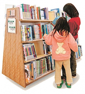 もう少し具体的に述べると、まず、大切な本の展示棚であるべき書架が、奥深い収納棚である。小学校の見上げるような高書架が、小学生にとっては「怖い」ものであることに気づく者がいない。そこで考案開発したものが写真1のような書架である。最下段まで、全段のすべての本が1冊1冊粒だって子どもたちに呼びかけてくる展示架である。一昨年の熊本地震で、平湯モデルの書架だけが、こわれることも倒れることもなく、本が落ちることさえほとんどなかったと報告をうけた。