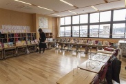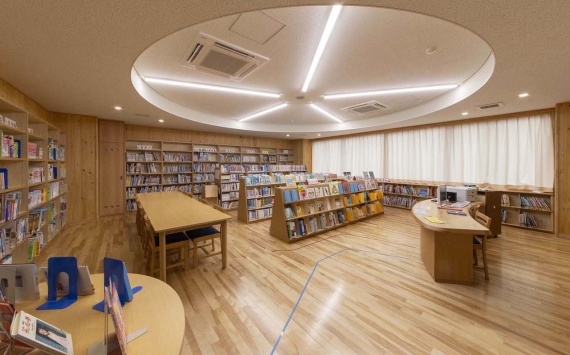 笠間小学校は旧校舎が老朽化したため改築され、2018年春から新しい校舎での学校生活が始まっています。新しい図書館は、校舎の中心となる2層吹き抜けの「だんだんホール」と連動して使うようにも考えられており、子どもたちの交流の場にもなっています。