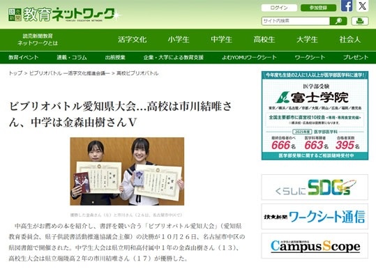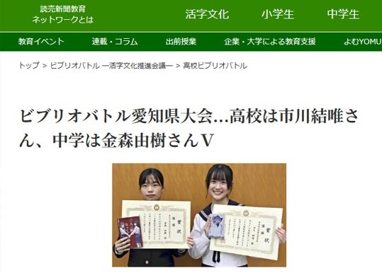 ビブリオバトル愛知県大会...高校は市川結唯さん、中学は金森由樹さんV ~読売新聞 教育ネットワーク【外部リンク】