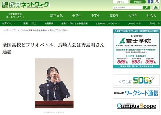 全国高校ビブリオバトル、長崎大会は秀島鳴さん連覇 ~読売新聞 教育ネットワーク【外部リンク】
