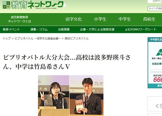 ビブリオバトル大分大会...高校は波多野瑛斗さん、中学は竹島希さんV ~読売新聞 教育ネットワーク【外部リンク】