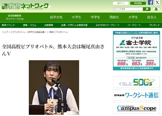全国高校ビブリオバトル、熊本大会は堀尾真由さんV ~読売新聞 教育ネットワーク【外部リンク】