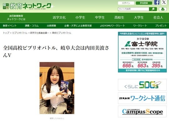 全国高校ビブリオバトル、岐阜大会は内田美波さんV ~読売新聞 教育ネットワーク【外部リンク】