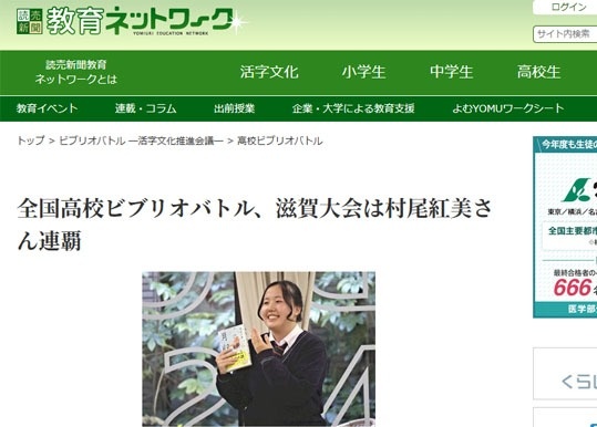 全国高校ビブリオバトル、滋賀大会は村尾紅美さん連覇 ~読売新聞 教育ネットワーク【外部リンク】