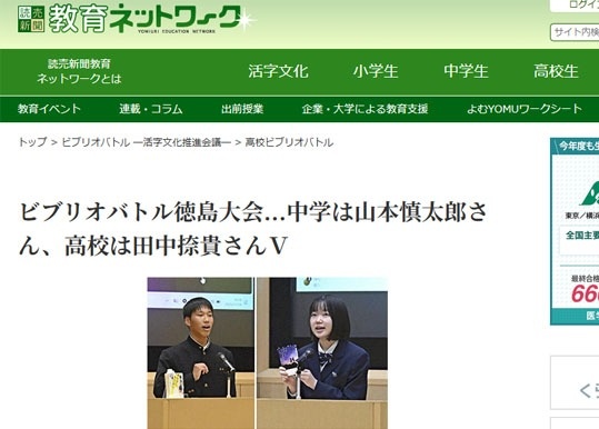 ビブリオバトル徳島大会...中学は山本慎太郎さん、高校は田中捺貴さんV ~読売新聞 教育ネットワーク【外部リンク】