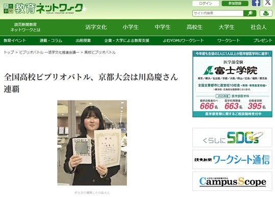 全国高校ビブリオバトル、京都大会は川島慶さん連覇 ~読売新聞 教育ネットワーク【外部リンク】