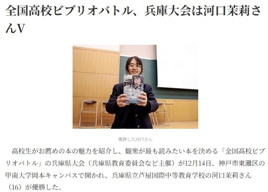 全国高校ビブリオバトル、兵庫大会は河口茉莉さんV ~読売新聞 教育ネットワーク【外部リンク】