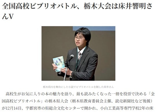全国高校ビブリオバトル、栃木大会は床井響明さんV ~読売新聞 教育ネットワーク【外部リンク】
