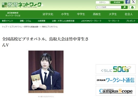 全国高校ビブリオバトル、鳥取大会は竹中芽生さんV ~読売新聞 教育ネットワーク【外部リンク】