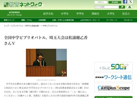 全国中学ビブリオバトル、埼玉大会は松浦穂乙香さんV ~読売新聞 教育ネットワーク【外部リンク】