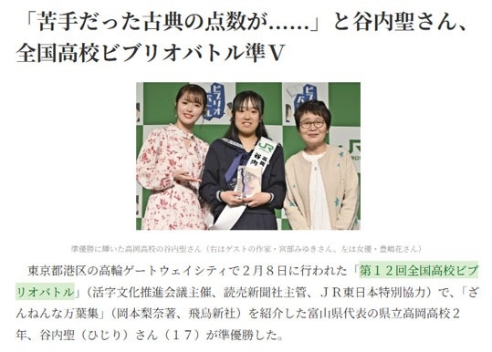 「苦手だった古典の点数が......」と谷内聖さん、全国高校ビブリオバトル準V ~読売新聞 教育ネットワーク【外部リンク】
