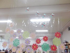 展示台の上のディスプレイはコスモスと赤トンボ。トンボは平面的にならないように立体にしてみました。