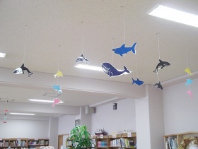 今回の魚たちは、数年前の読書ボランティアのお母さま方がお話会に作られた作品を使わせていただきました。大きくキラキラ鱗のついた魚たちいっぱいで見ごたえのあるディスプレイになりました。