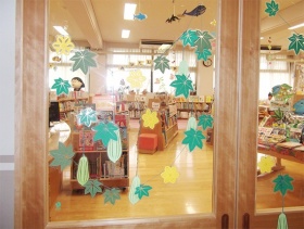 夏らしくヘチマを飾ってみました。毎年は、天井でゆれているのですが入口で使うと子ども目線からもよく見てもらえます。