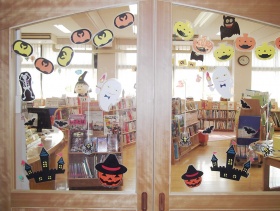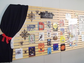 掲示板、入口から展示台、ハロウィン一色です。ハロウィンの季節の読書マラソンは『ゾクゾクシリーズ』です。いろいろなお化けがでてきて低学年でも楽しく読めます。