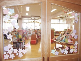 掲示板、入口は桜の花で卒業、入学をかざりました。