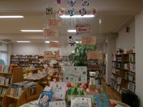 立体の桜とチューリップで台の上をかざり、桜や新入生の本を特集しました。