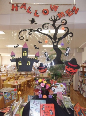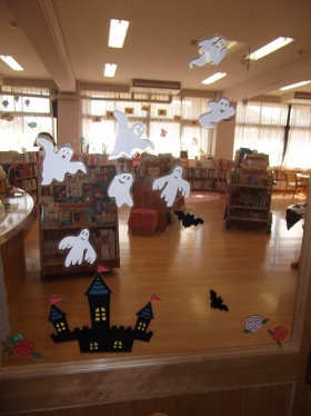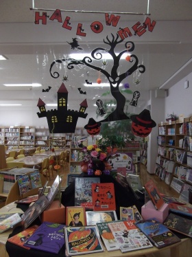 レポート - 2017年01月12日 京都聖母学院小学校 図書館:H28年10月の展示報告 10月のテーマは「ハロウィン」 掲示板 掲示板 掲示板も展示台もハロウィン一色です! 展示台 展示台のディスプレイもお化けの木を新しく作りました。 扉 扉はゴーストが飛んでいます。 今年もハロウィンの「トリック オア トリート」の合言葉で図書館オリジナルしおりがもらえる特別企画は大混乱するほどの盛況でした。