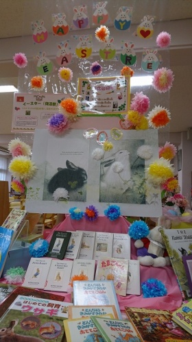 展示台の特集はイースターとうさぎの飼い方、うさぎがでてくるお話の本です。