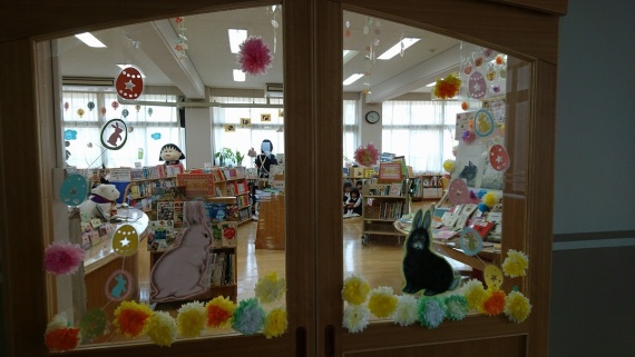 長年、秋の読書週間で子ども達に手作りお話会をしてくださったお母さんたちの多くが6年生の保護者なのでこの春卒業されます。最後にお話会で作ってくださった『白いうさぎと黒いうさぎ』のパネルとおはながみで作った花のディスプレイで卒業をお祝いました。
