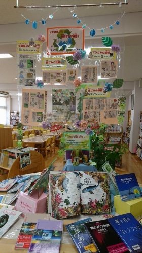 展示台に集めた本はエコやリサイクルなどの環境問題の本だけでなく、「美しい地球」を知ってもらうために大自然や大自然に生きる動物のきれいな写真集などを展示しました。きれいな地球や動植物の姿を知り、守っていくために何か出来る事はないかと考えるきっかけになればと思いました。ご飯を残さずに食べるのも自分達にできることの1つです。