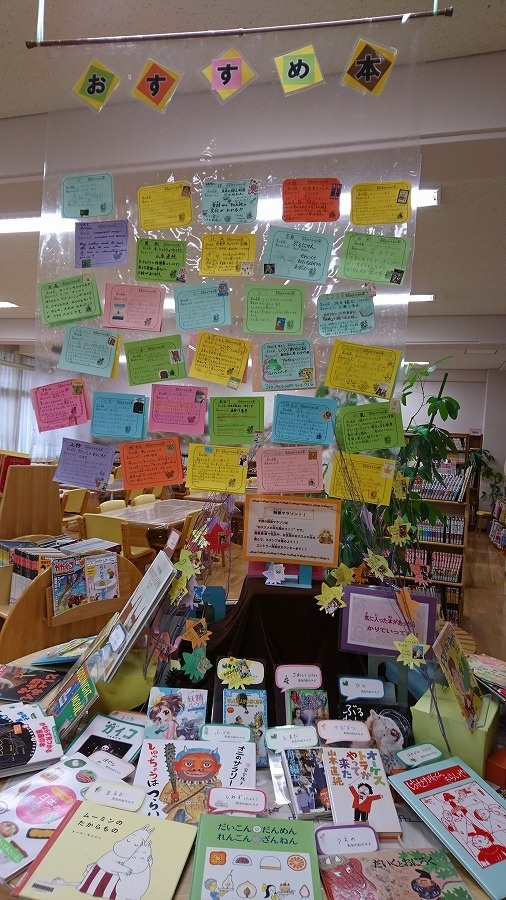 展示台では、先生たちのおススメの本を紹介しています。先生が紹介して下さった本は子ども達にも大人気です。