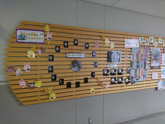 ■あいにく、すっきりしたお天気が少なく、お月さまがはっきり見える日はすくなかったですが、掲示板では月の欠け満ち、月面模様などの写真を飾りました。