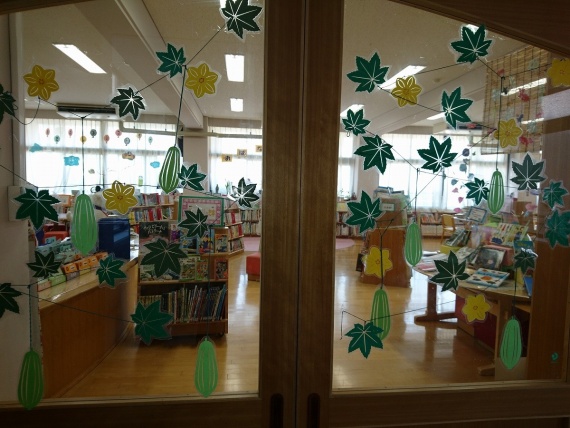 飾りつけは「すだれ」を使って金魚、朝顔を作ってみました。