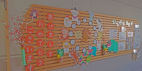 掲示板では十二支のかざりが。もちろん真ん中はイノシシです。