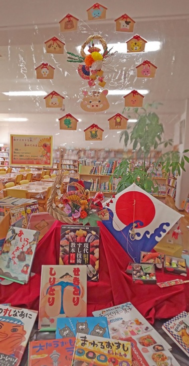 展示台にはお正月なので「和」に関する本を集めました。「和」に関する絵本って・・・ 和菓子、和食(おすし、おにぎり、たこやき(?))、きもの、ぼんさい、しめ縄、おみぐじ、狂言などなど、けっこうあるものです。これをきに、日本のすてきな文化を知ってもらえればと思います。