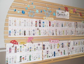 裏話をすると、「明日、大勢の見学者が来る!」という前日の午後に何を思ったか展示台を取っ払ってしまいました。おススメの木の葉っぱは児童に返却してしまったし…。何もない展示台で見学者を迎えることはできないし…。私の中には、次の展示では本物の傘を使う!(100円ショップの透明の傘)ぐらいのイメージしかなく・・・。すぐに傘を買いに行き、とりあえず、いろんな切り紙の型紙を作って家で内職。次の日、朝早く出勤し、飾りつけしながら、「ごめん、今回はこれで我慢してね」と思っていたところに、登校してきた2年生の男の子の顔が扉の前にくると「わぁー!」っと明るく輝きました。「どお?」「すごくいい!」一晩で作った展示だけど、子どもには一番うけた?傘からいろんなモノがぶら下がってるのがよかったか?