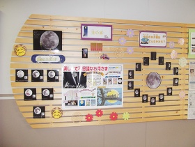 掲示板:去年の展示台で活躍した月の満ち欠けの写真やクレーターの模様です。