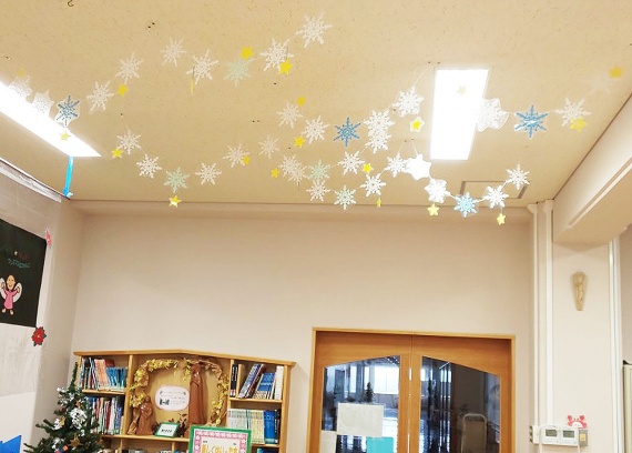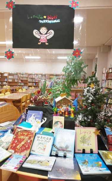 天井には雪の結晶を飾り、展示台にはクリスマスの本をあつめました ~京都聖母学院小学校 令和2年12月の展示報告