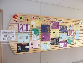 短期大学の学生の制作物(おすすめの本の紹介)をおかりして、図書委員が参考にしながら作った作品です。作品選び(紹介したい本を選ぶ)、本がはえる色画紙を選ぶ、画面構成を考える・・・委員会2回以上かけた大作です。