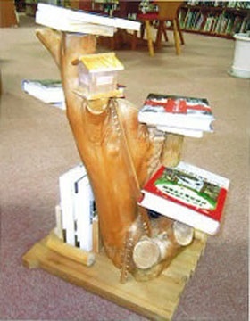 手づくりのブックスタンドはずいぶんたくさんつくりましたが、こんなのは始めてです。製材所でもらったときから、ブックスタンドをつくりたいと思いつづけてきたものです。妻にもツリーハウスをつけたらいいとアイディアをもらいました。そのツリーハウスに裏側から長い梯子もつけました。<写真下> 近くの平湯モデルの純心女子中高校図書館に差し上げました。生徒たちが楽しんでくれるといいのですが――。