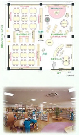 その新しい展開については次号で紹介する予定ですが、今回はパンフから、小学校(下左)と中高校図書館(下右)のレイアウト図を紹介します。