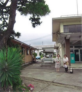 右が地震で使えなくなった本館。左が、日本 ユニセフ協会その他たくさんの方々の協力によりできた「どんぐり子ども図書館」。ほかにも、本館のまわりに、様々な方々や団体の協力により、小さな図書館がいくつもできて利用されていました。左が館長さん。