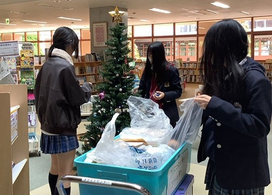 クリスマスツリーを出しました!建築家の妹島和世さんの本を集めて展示しています。ジェーン・スーさんは紹介記事なども併せて展示中です。 ~恵泉女学園 中学・高等学校【外部リンク】