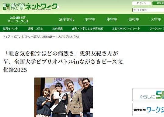 「吐き気を催すほどの痛烈さ」兎沢友紀さんがV、全国大学ビブリオバトルinながさきピース文化祭2025 ~読売新聞 教育ネットワーク【外部リンク】