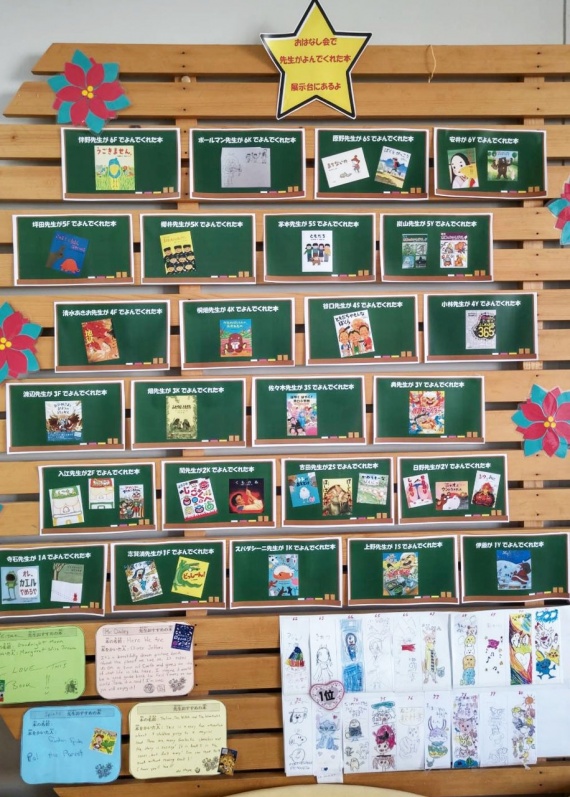 展示台の前にはクリスマスの本、裏には「先生のおはなし会」で読んでもらった本を集めました。