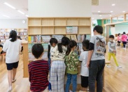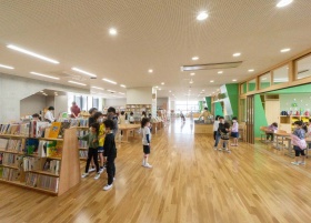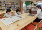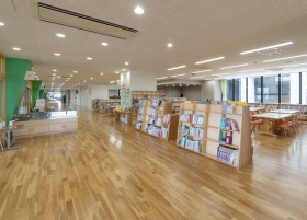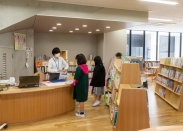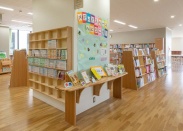 2階のメディアスペース(図書館)は昇降口を入った左側、1・2年生の教室と廊下を挟んで向かいにあり、壁面などがないオープンなつくりとなっています。休み時間には教室から出てきた子どもたちの多くがメディアスペースに流れるように入っていき、読書を楽しんだり友達と話したりする姿が見られます。
