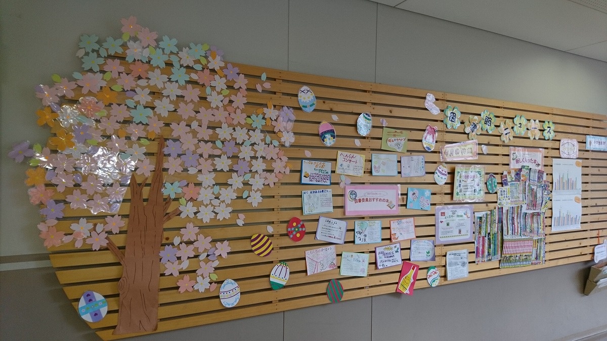 掲示板:桜の花と、図書委員の低学年向けのおススメの本ポップです。図書館の隣は2年生の教室なので、新しく入ってくる1年生と2年生むけの本を紹介してもらいました。