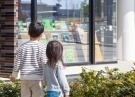 「えほんのエリア」の絵本架は、小さな子どもの目線に合わせて高さを抑えており、館内の見通しを良くするとともに、ガラス越しの屋外との一体感も高めています。また、窓際の長い絵本架は、子どもの興味を誘うよう、たくさんの絵本の表紙を見せて展示しています。