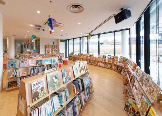 このエリアは子どもたちが床に座って本が読めるように、靴をぬいで入るようにしており、本を広げて読める丸テーブルが置かれています。冬には床暖房も完備されています。