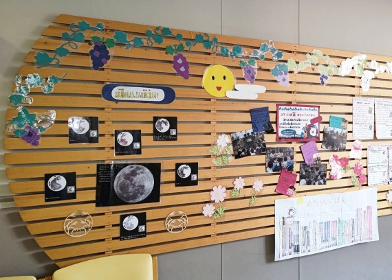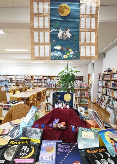 展示台の上のディスプレイは“開けた障子の向こうに広がる風景”をイメージして作ってみました。展示台の月に関する科学絵本の貸出も好調でした。月に関する絵本を読み聞かせし、本の紹介をすると多くの子ども達が興味を持って借りてくるれます。