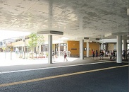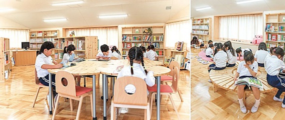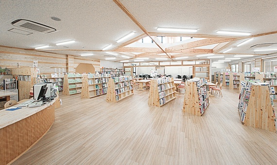 2階の交流室は、小学校、こども園、地域住民が利用する場です。そこには、図書スペースが設けられ、地域の方々が子どもたちに読み聞かせなどすることを想定しています。寺部地区では、以前から読み聞かせのグループが活動しているそうです。そして、予想以上に活用されているのが、1階の二施設間に設けたピロティーで、小学校やこども園のお母さんたちの井戸端会議でいつも賑わっています。