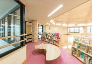 中・高学年のゾーンには、教室やメディアセンターがあります。メディアセンターには、平湯モデル※図書館家具を採用しています。家具のレイアウトや配架に協力していただいた平湯文夫氏と事前に面談した際に、「家具のレイアウトと空間づくりが連動できるといいね」という話が出ました。それに応えるため、中央の調べ学習のエリアが子どもたちの居場所となるよう、上部のハイサイドライトから光が差し込むように設計しました。