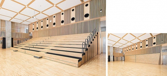 1階多目的ホールに設置された移動観覧席は、手動式で集会やイベントなどに合わせて設置・収納ができる。隣接する東中学校の生徒も利用することがあり、小中連携を図っている。
