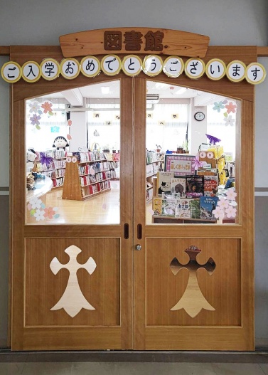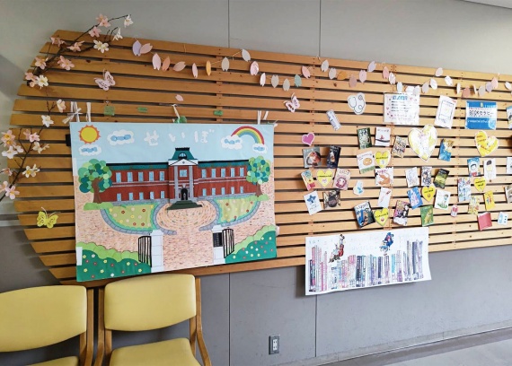 掲示板には聖母の本館の絵を。(ずっと前の図書館ボランティアのお母さんたちの作品です)