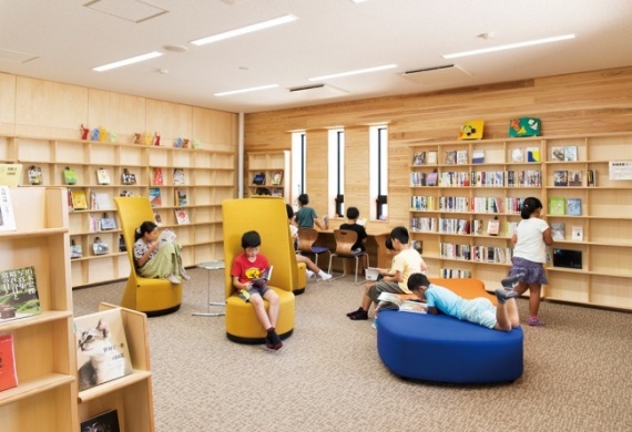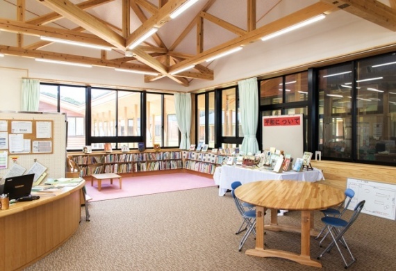 また、作手地区は「あめんぼ読書会」という読み聞かせ活動をするグループもあるほど図書活動が盛んなエリアです。そこで図書室の設計にあたっては、図書室とパソコン室を一体化した小学校の「メディアセンター」と地域の「図書室」を、廊下を挟んで隣接させ、相互に行き来ができ、交流や情報交換などが行える配置としました。さら、“作手らしい図書館”について検討した地域や子ども達のWSを経て、読み聞かせスペース、くつろぎや交流のスペースを重視した、家具選定とレイアウトとしています。